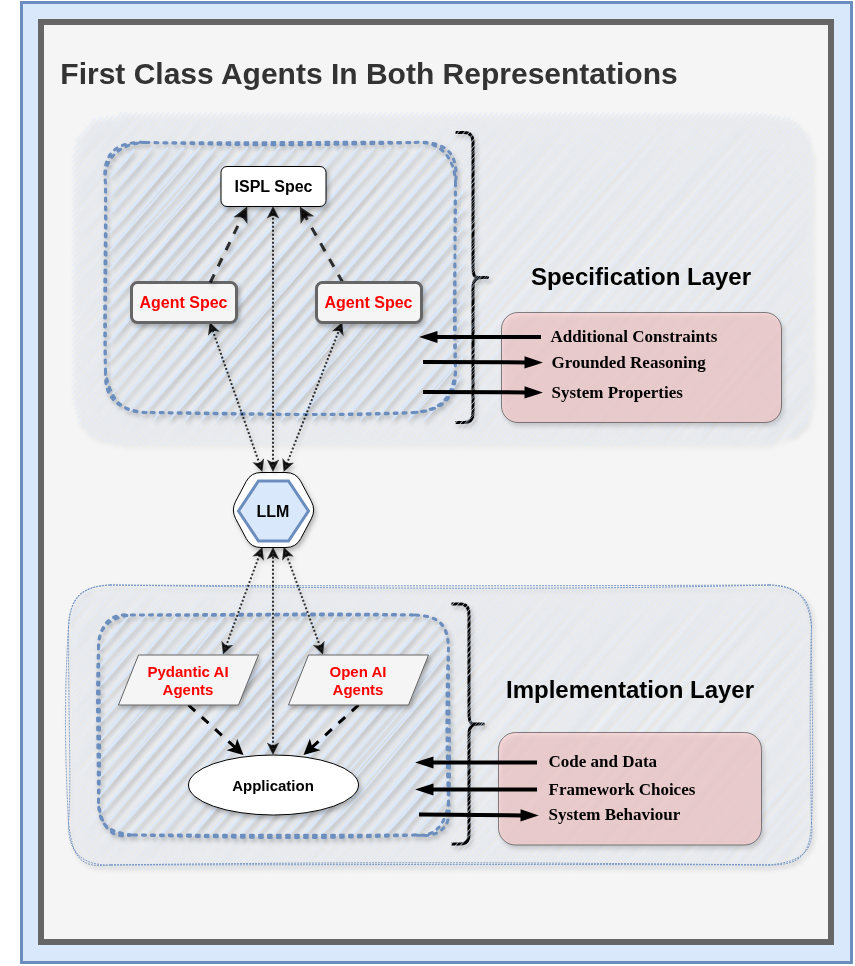So far, this might seem like an argument for formal specifications in general. But the intriguing part about stealing ideas from ABM / MAS is that we can get a "first class" agent abstraction on both sides of the representational hierarchy.